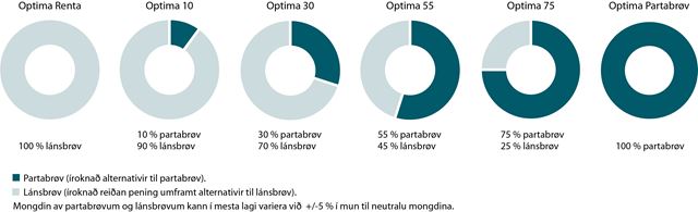 BankInvest bjóðar Optima, sum kann bólkast í 6 váðabólkar. Hesir eru m.a. samansettir av partabrøvum og lánsbrøvum. Út frá tínum íløguprofili finna vit út av, hvat íløguprógv hóskar tær best.